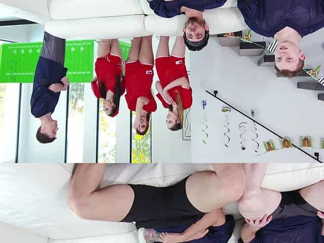 Three horny soccer fans teens share the same big cock instead of watching a game