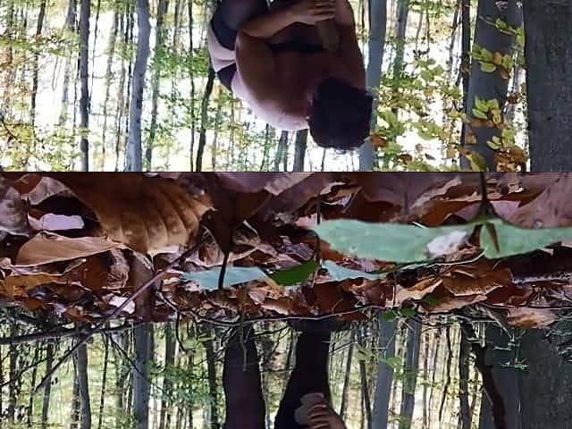 Voyeur in the woods spying on a girl who masturbates to orgasm with a squirt. Big ass and hairy pussy.