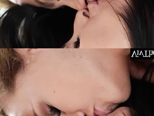 Wearing sexy dresses, lesbian lovers Hannah Vivienne and Jasmine Webb kiss passionately in their bedroom