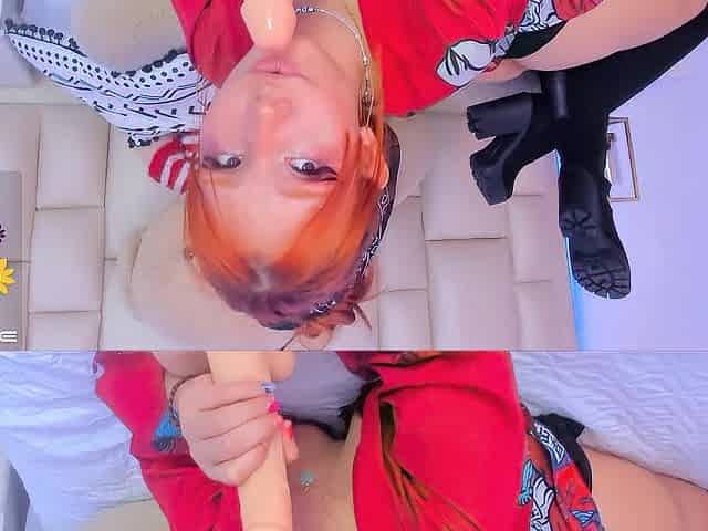 Pretty redhead with a cute face enjoys sucking a large thick schlong