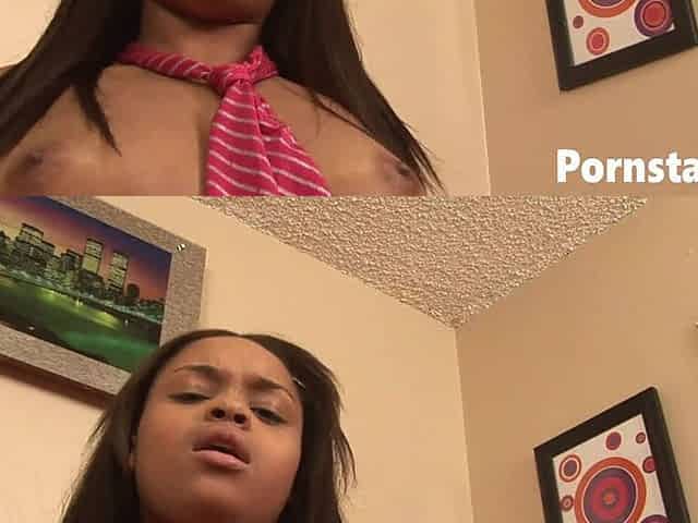 Ebony coed Jenna Foxx sucks off a big dildo and rubs her sweet young pussy