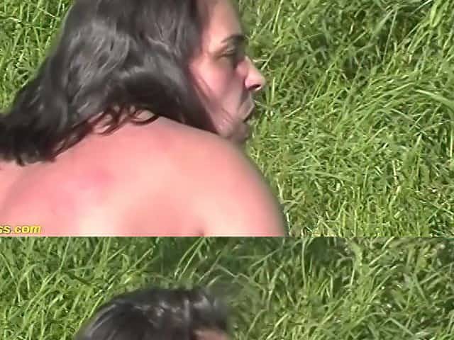 Sexy grandma is used by 2 studs outdoors
