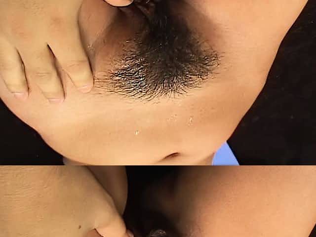 Brunette lesbian enjoying her hairy pussy being screwed using a toy
