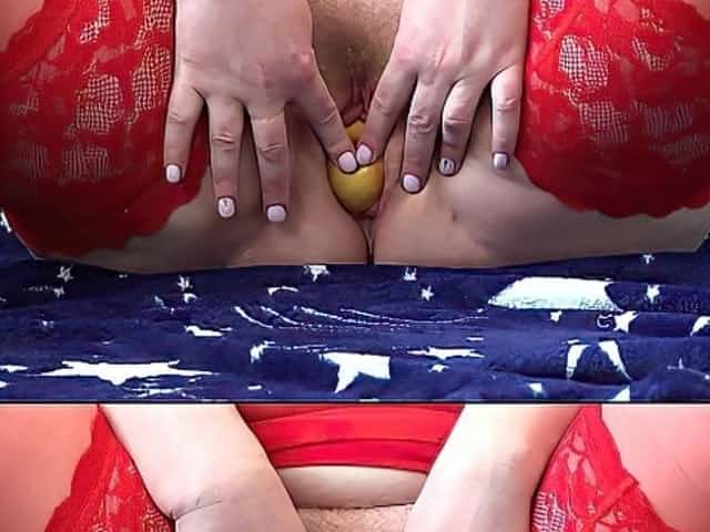 Mature milf with big tits makes a fisting and inserts an apple into a juicy hole