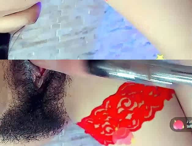 Banging my soaked and hirsute vagina and sucking melons