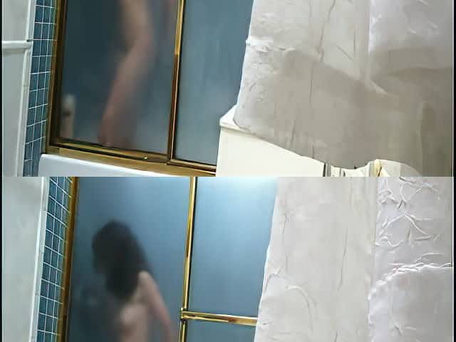 Skinny brunette chick with hairy pussy takes a shower