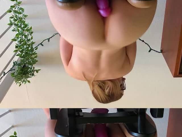 Young bookworm with saggy boobs rides new sex toy at home