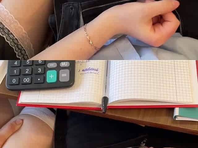 SCHOOLGIRL TUGJOB to a CLASSMATE underneath the table at math class
