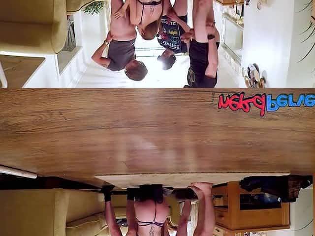 Hot woman gives in to two well hung guys !
