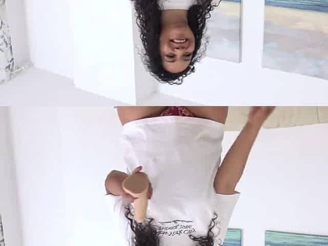 Fit girl in cute panties masturbating her pussy with a dildo until boyfriend comes to help