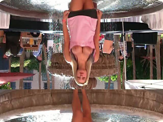Gorgeous blonde with big boobs playing with her shaved pussy in public