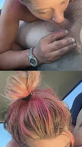 Streetwalker in a tube top does a bbbj and takes a load in her whore mouth at the end