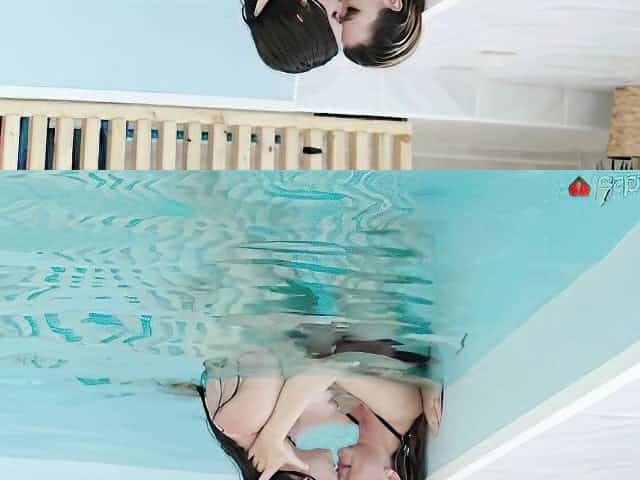 Hot girls in bikinis kiss next to the pool then eat pussy indoors
