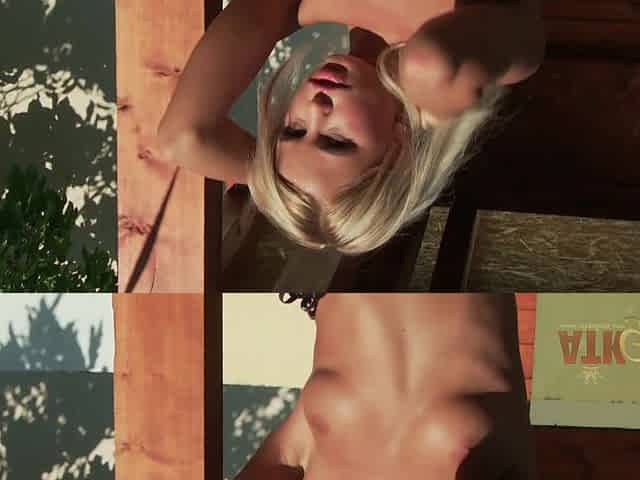 Olivia,the hot petite blonde gets naked outside and finger her little pussy