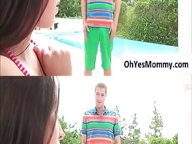 Lewd friend's mommy India Summer gives a blowjob and gets her slit fucked by the poolside