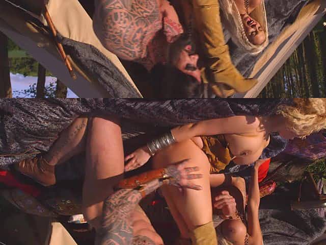 A strong man gets naked and fucks two hot women in a tent