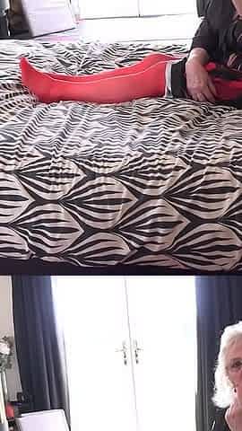 in nylons massages her large melons and old snatch