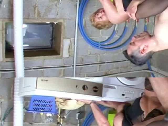 Busty granny fucks in nylons in the laundry room