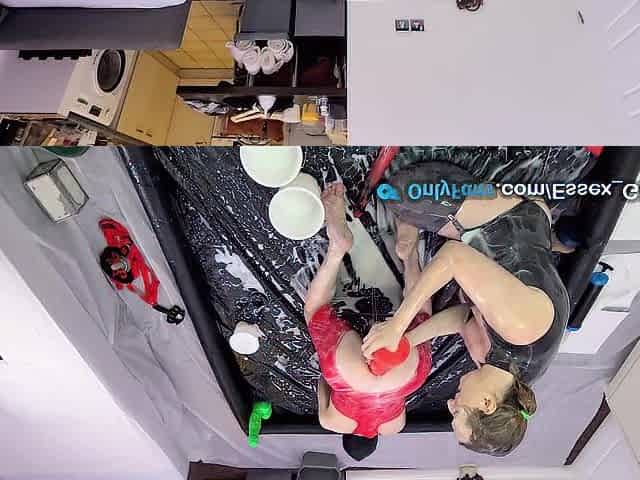Playing with slime lube and large dildos in the paddling pool.