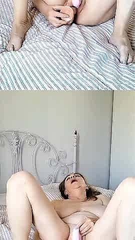 Blonde Housewife with big boobs masturbates with huge dildo