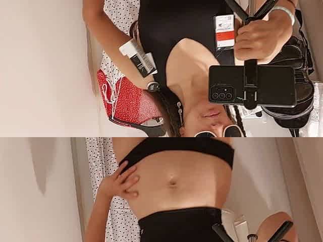 Inexperienced wife Mirsur filmed trying on clothes in the fitting room, showing off her big nipples and hairy ass