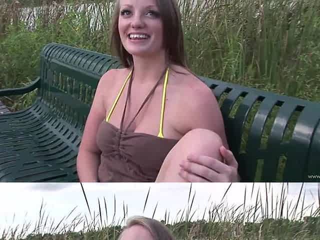 Busty brunette babe Savana gives oral pleasure outdoors