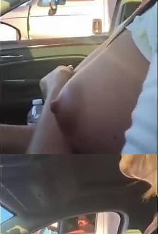 aged woman touches her large boob rolling next to a trucks
