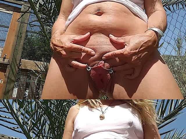 nippleringlover standing up peeing in the garden widening pierced cunt wide open