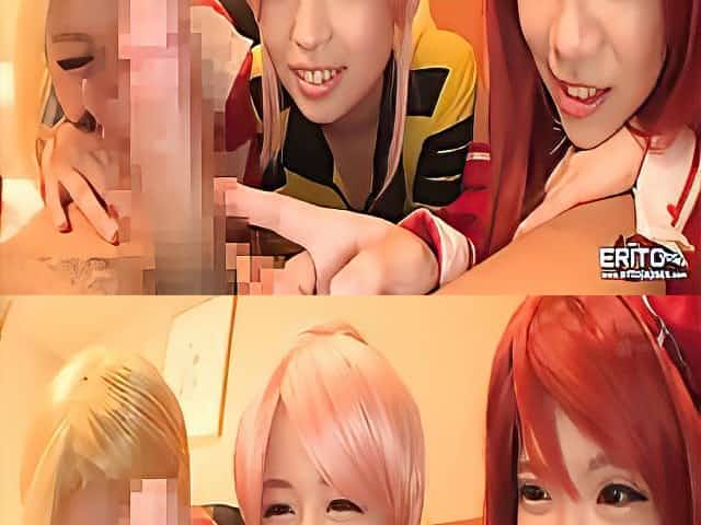 Busty Japanese cosplayers shares on sucking cock and cum