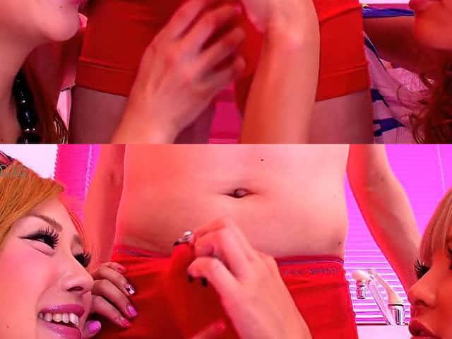 Pair of naughty Japanese babes playing with their buddy's boner