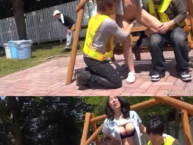Japanese MILF having a great time in her yard with two hot guys