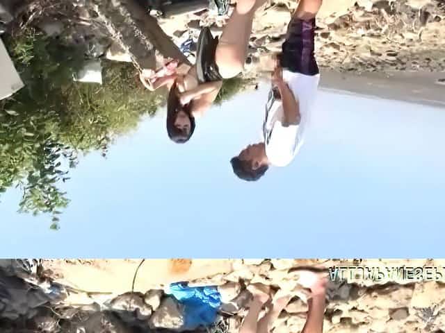 Busty Asian maid in fishnet stockings having a threesome in the wild