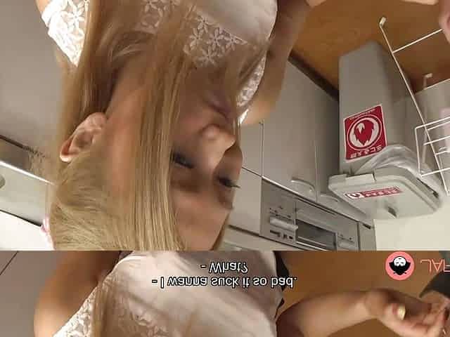 "Japanese housewife sucks dick in the kitchen uncensored."