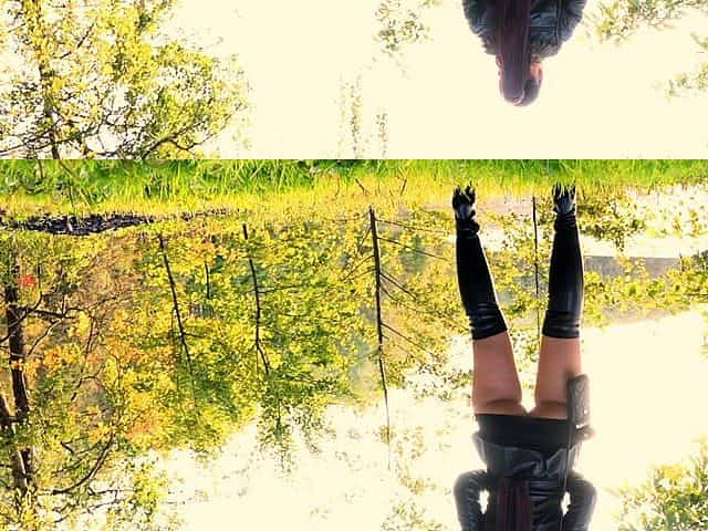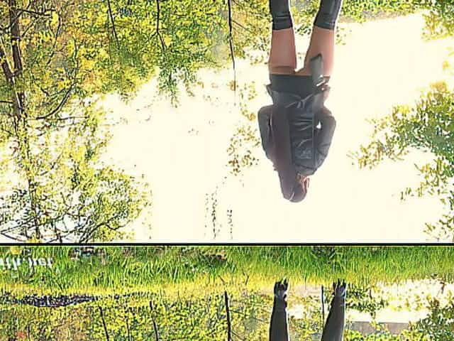 Jeny Smith in nylon pantyhose without panties shocked a biker in the forest. Bottomless in Public.