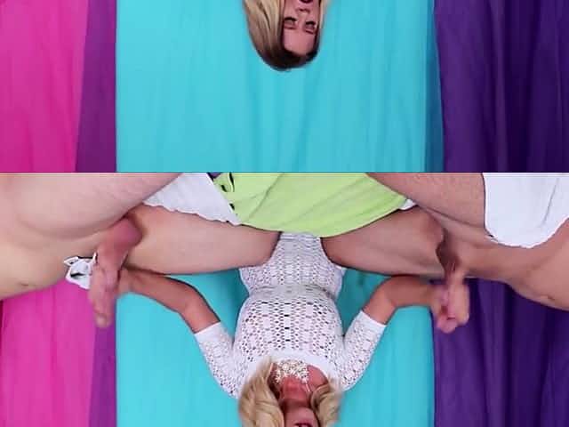 Redhead and skinny teen in socks jerking big dildo