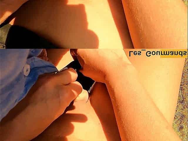 Cum over my pussy giving hand relief naked in the dunes on the public beach after stripping off and wanking cock