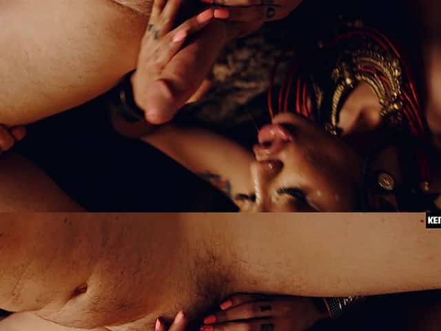 Ebony hottie Julie Kay pleasures a stiff white cum gun with her wet cunt