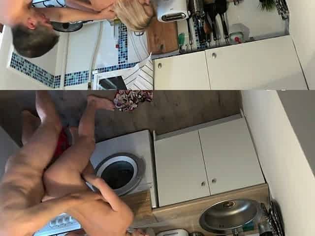 In the kitchen, a horny blonde housewife gets fucked hard in both holes
