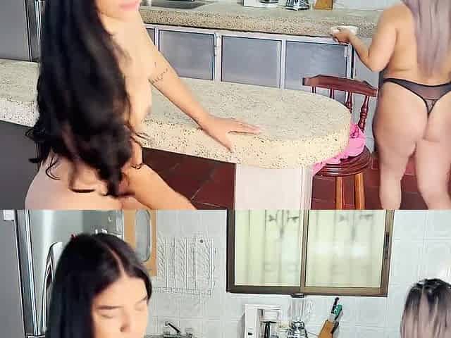 In the kitchen, two lesbian beauties explore each other's wild desires