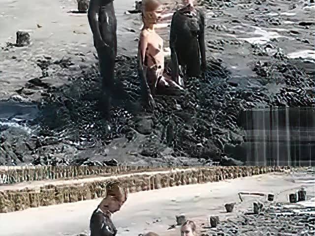Young ladies coat their bodies in dark mud