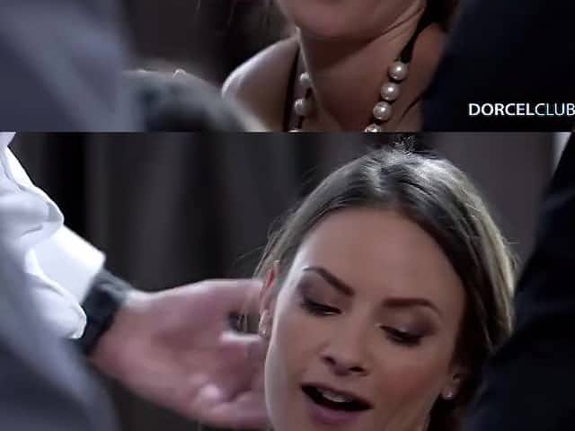 Lana Rhoades is wearing her best lingerie and stockings while having a threesome with rich people