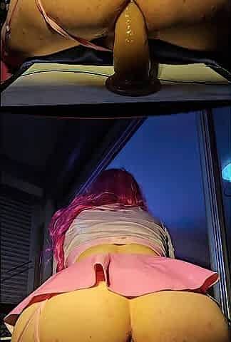 Sissy Lola jupe hot en latex rose monte vigouresement sur son gros god