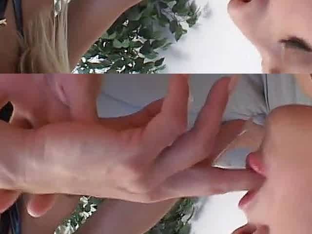 Ugly older blonde finger-fucks young babe then babe sucks blonde's strap-on