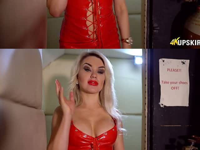 Lusty blondie in red latex dress gives head after kissing her gf