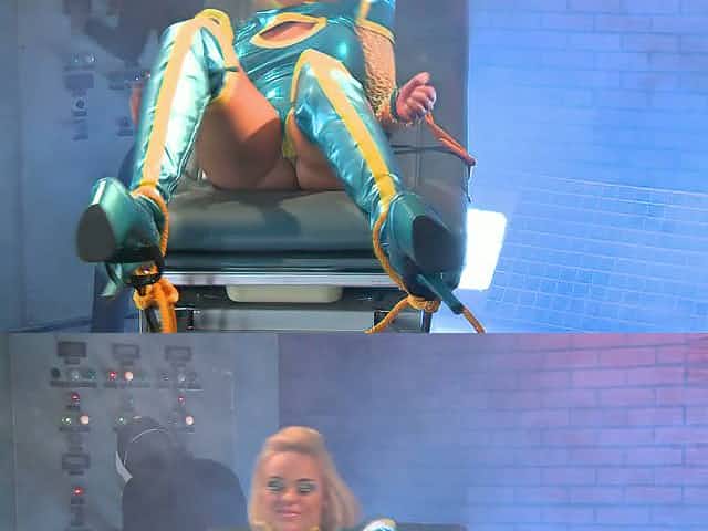 Sexploitress blond babe in latex costume gets fucked doggy pose