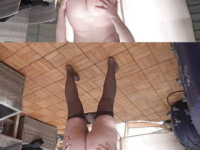 "Black Pantyhose and Leather Coat Flashing in the Yard"