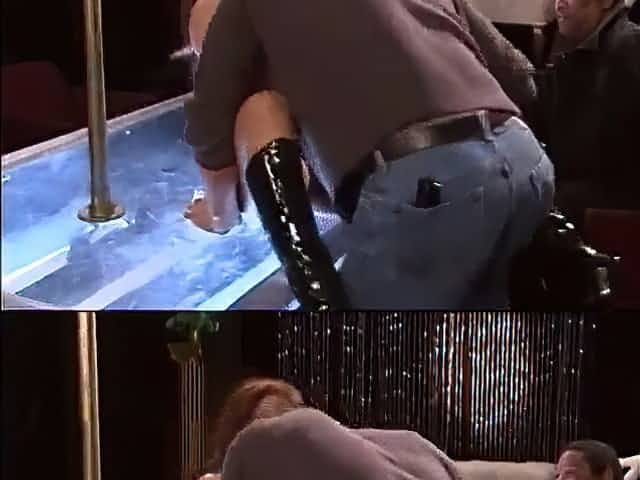 After the performance, a beautiful brunette hair in leather boots gives a oral sex to a brawny chap on stage