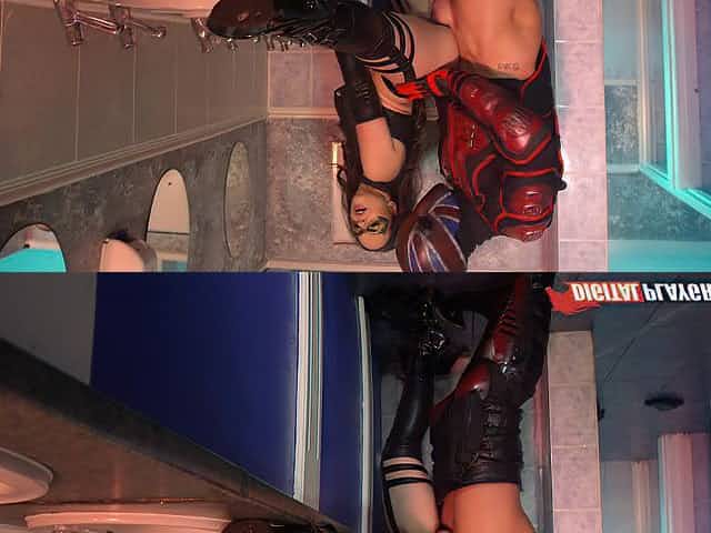 Adorable chick with a mask banged by the superhero in the bathroom