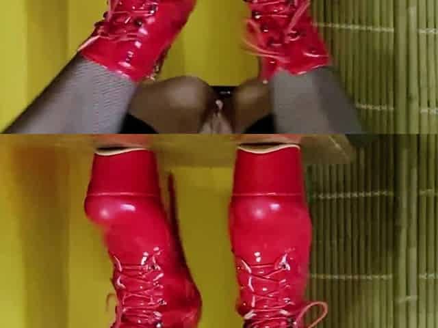 Red XXX fucks herself while wearing leather boots