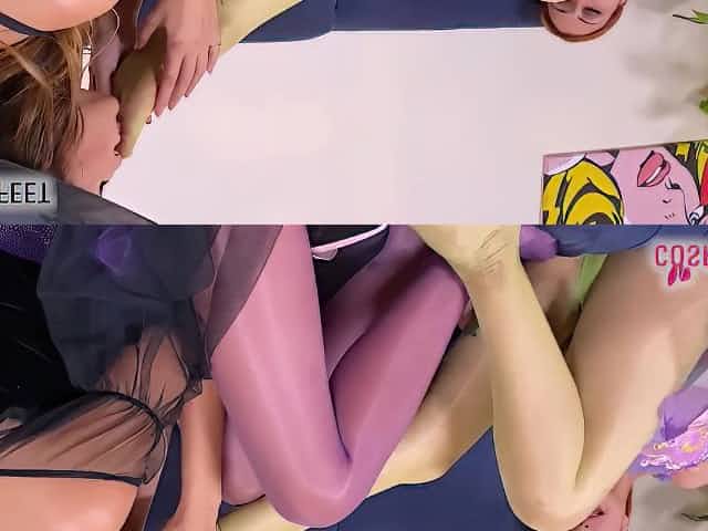 Lesbian cosplayers foot worship in colored pantyhose